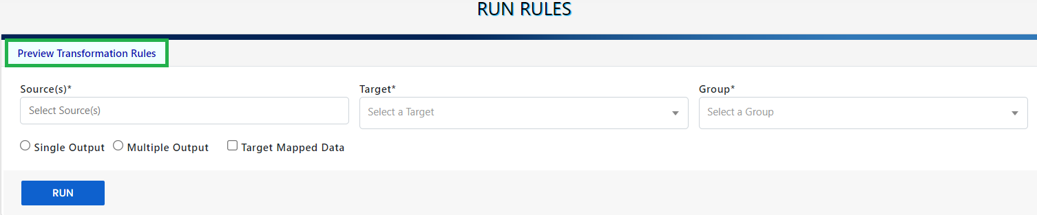 Once the business user has created Transformation rules for a set of Source and Target data, these need to be implemented. The Run Rules page is designed for this. It has three tabs, Preview Transformation Rules, Create New Workflow, and Run DQ Rules.